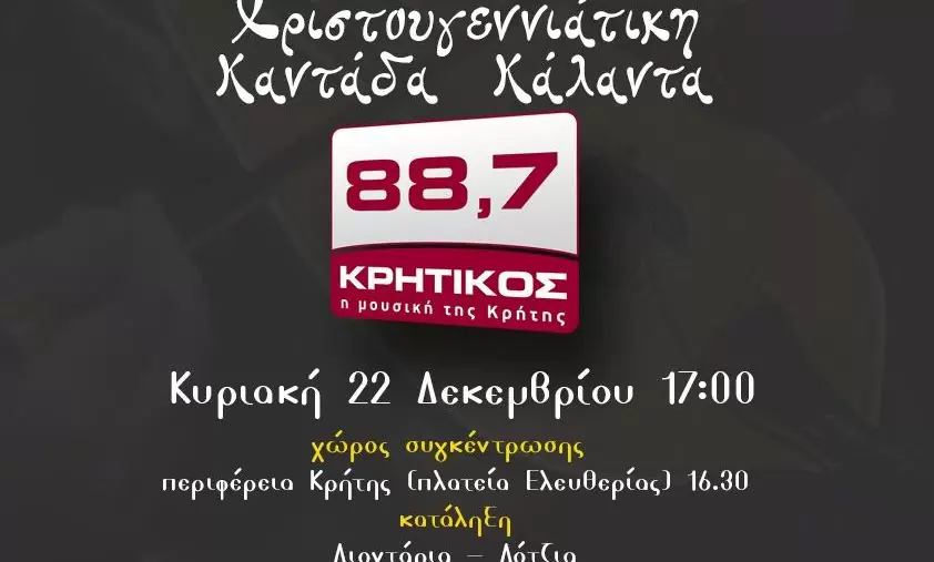 Ο Kρητικός 88,7 διοργανώνει σήμερα στις 5 το απόγευμα στο Ηράκλειο την Χριστουγεννιάτικη Καντάδα και κάλαντα με πλήθος χορευτών από τον λαογραφικό “όμιλο Λάζαρος και Μανώλης Χνάρης”, κρητικούς καλλιτέχνες και μαντιναδολόγους.
