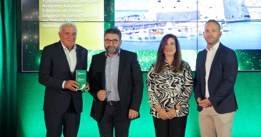 Το χρυσό βραβείο στην κατηγορία της Μείωσης Κατανάλωσης Νερού στα Enviromental Awards 2024 απέσπασε η ΔΕΥΑ Ηρακλείου σε συνεργασία με την Olympios Group σε ειδική εκδήλωση που πραγματοποιήθηκε στην Αθήνα. Μεταξύ 190 διαγωνιζόμενων επιχειρήσεων, εταιριών και οργανισμών, η ΔΕΥΑΗ ξεχώρισε για το έργο της Παροχής Υπηρεσιών, της Προμήθειας και Εγκατάστασης Ψηφιακών Υδρομετρητών και Συστήματος Αυτόματης Ανάγνωσης Ενδείξεων και Ελέγχου Διαρροών στα Δίκτυα Ύδρευσης της Παλαιάς Πόλης του Ηρακλείου. Σημειώνεται ότι τα Environmental Αwards 2024 είναι τα μοναδικά  βραβεία που αναδεικνύουν και επιβραβεύουν καλές πρακτικές και πρωτοβουλίες για την προστασία του Περιβάλλοντος και την Αειφορία, καθώς και καινοτόμα «πράσινα» έργα, τεχνολογίες ή προγράμματα. Στην ειδική εκδήλωση παρέστησαν ο Πρόεδρος της ΔΕΥΑΗ Γιώργος Βουρεξάκης, ο Γενικός Διευθυντής Μανόλης Κοσμαδάκης, ο Πρόεδρος του Σωματείου Εργαζομένων Μανόλης Σκεπασιανός, ο Προϊστάμενος του Τμήματος Ύδρευσης Γιώργος Σαμαριτάκης, η Υπεύθυνη του Τμήματος Ύδρευσης Φανή Νικοπούλου και ο υπάλληλος Γιάννης Λιναρίτης.