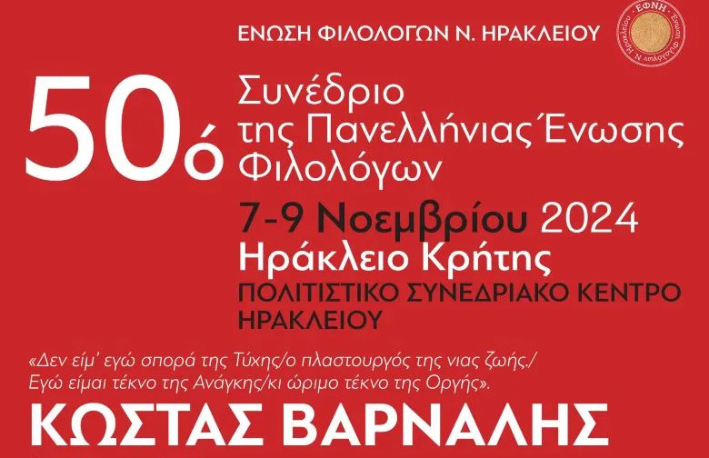 Η Ένωση Φιλολόγων Ν. Ηρακλείου (ΕΦΝΗ) έχει την τιμή να φιλοξενεί οργανωτικά το 50ο Συνέδριο της Πανελλήνιας Ένωσης Φιλολόγων (ΠΕΦ),  που είναι αφιερωμένο στον Κώστα Βάρναλη και θα διεξαχθεί στο Ηράκλειο Κρήτης,  7 – 9 Νοεμβρίου 2024 , στο Πολιτιστικό Συνεδριακό Κέντρο Ηρακλείου (ΠΣΚΗ), Πλαστήρα & Ρωμανού. Το Συνέδριο διεξάγεται με την υποστήριξη της Περιφέρειας Κρήτης και την οργανωτική επιμέλεια της Ένωσης Φιλολόγων του Ν. Ηρακλείου (ΕΦΝΗ) και τελεί υπό την αιγίδα του Πολιτιστικού Συνεδριακού Κέντρου Ηρακλείου. Σε μια περίοδο που η ανθρωπότητα σκιάζεται από την απειλή μιας γενικευμένης πολεμικής ανάφλεξης, που καταπιεσμένοι λαοί υψώνουν ηρωικά το ανάστημά τους για λευτεριά, ανεξαρτησία και πατρίδα, σε μια ιστορική φάση που τα δημοκρατικά δικαιώματα και οι κοινωνικές ελευθερίες δοκιμάζονται από την επικίνδυνη εξάπλωση  αντιδραστικών ιδεών, η ποίηση του Βάρναλη και γενικά ο λόγος των ποιητών μπορεί  και χρειάζεται να ακουστεί ξανά στα αυτιά, τον νου και την καρδιά των ανθρώπων και να γίνει το «φως που καίει» το φως μιας ηχηρής και ισχυρής απάντησης για την παγκόσμια φιλία και ειρήνη. Σήμερα, που οι μορφωτικές κατακτήσεις αμφισβητούνται και τα προβλήματα στην Εκπαίδευση πολλαπλασιάζονται, εμείς ως ΕΦΝΗ, ως συλλογική φωνή έκφρασης των φιλολόγων του νομού μας- ακούγοντας τη διαμαρτυρία του ποιητή :«Γανιάσατε, δάσκαλοι, να ξεμάθω να ’μαι εγώ, να στοχάζομαι, να θέλω..»– επιδιώκουμε με την ανάληψη αυτής της πρωτοβουλίας να τονίσουμε και να αναδείξουμε τον αφυπνιστικό ρόλο του «μάχιμου φιλολόγου της έδρας» και γενικά του δασκάλου, που στις μέρες μας υποβαθμίζεται. Οι θεματικές ενότητες του Συνεδρίου έχουν ως εξής: Ο Κ. Βάρναλης και η εποχή του