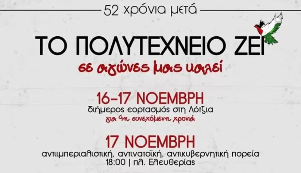 Οι Φοιτητικοί Σύλλογοι του Ηρακλείου απευθύνουν ανοικτό κάλεσμα συμμετοχής στον διήμερο εορτασμό της εξέγερσης του Πολυτεχνείου, που θα πραγματοποιηθεί στις 16 και 17 Νοεμβρίου στη Λότζια. Επίσης την Κυριακή 17 Νοεμβρίου, θα πραγματοποιηθεί η καθιερωμένη πορεία, με σημείο εκκίνησης την πλατεία Ελευθερίας, στις 6 το απόγευμα. Στην ανακοίνωση-κάλεσμα αναφέροντια τα εξής: «Σε λίγες μέρες συμπληρώνονται 52 χρόνια από την εξέγερση του Πολυτεχνείου, η οποία σημάδεψε ανεξίτηλα την ιστορία αυτού του τόπου, έδωσε το αποφασιστικό χτύπημα στην χούντα των συνταγματαρχών και καθόρισε την ελληνική κοινωνία, διαμορφώνοντας μια σειρά από κεκτημένα του λαϊκού και φοιτητικού κινήματος όπως τα γνωρίζουμε σήμερα. Ο αγώνας των φοιτητών αγκαλιάστηκε από ολόκληρη την κοινωνία, συμπύκνωσε ολόκληρο τον αντιδικτατορικό αγώνα και ενέπνευσε έναν ολόκληρο λαό να ορθώσει ανάστημα και να αγωνιστεί για την πτώση της χούντας. Ο αντιδικτατορικός αγώνας μας διδάσκει ότι ακόμα και στις πιο αντίξοες συνθήκες, απέναντι στα πιο αυταρχικά καθεστώτα, μέσα από συλλογικούς αγώνες μπορούμε να είμαστε εμείς αυτοί που θα καθορίσουμε το μέλλον μας και που τελικά θα χαράξουμε την πορεία της ίδιας της ιστορίας. Αυτή ακριβώς τη μνήμη της εξέγερσης προσπαθεί εδώ και έξι χρόνια να σβήσει η Νέα Δημοκρατία και οι εγκάθετοί της στα πανεπιστήμια, γνωρίζοντας το ειδικό βάρος των φοιτητών οι οποίοι έπαιξαν και συνεχίζουν να παίζουν πρωτοπόρο ρόλο στους αγώνες ολόκληρου του λαού.  Όμως, όσο και να προσπαθεί η κυβέρνηση να μας κάνει να ξεχάσουμε κάθε μεγαλειώδη αγώνα της ελληνικής κοινωνίας, εμείς γνωρίζουμε πολύ καλά ότι η εξέγερση του Πολυτεχνείου είναι μια ζωντανή ιστορία και ταυτόχρονα φάρος των διεκδικήσεων μας στο σήμερα. Τη στιγμή που η Νέα Δημοκρατία στην εξαετή διακυβέρνησή της έχει ακολουθήσει μια άκρως επιθετική πολιτική απέναντι στα λαϊκά στρώματα και την νεολαία, τα συνθήματα του Πολυτεχνείου όπως το “Ψωμί Παιδεία Ελευθερία” και “Έξω οι ΗΠΑ – Έξω το ΝΑΤΟ” παραμένουν επίκαιρα».
