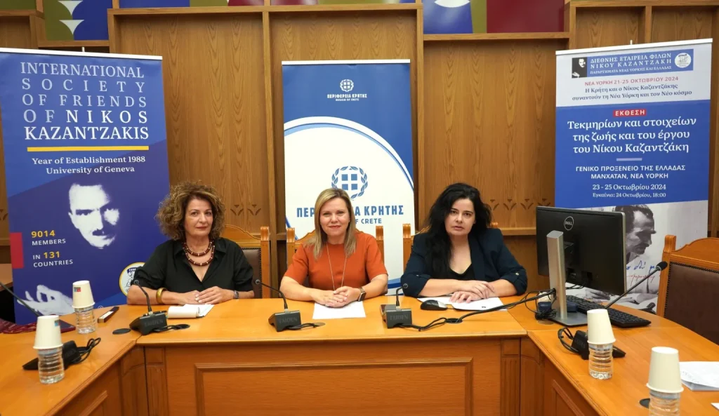 Οι σπουδαίες εκδηλώσεις με τίτλο «Η Κρήτη και ο Νίκος Καζαντζάκης συναντούν τη Νέα Υόρκη και τον Νέο Κόσμο» που πρόκειται να πραγματοποιηθούν στη Νέα Υόρκη, από 21 έως 25 Οκτωβρίου 2024, με την υποστήριξη της Περιφέρειας Κρήτης, τη Διεθνή Εταιρεία Φίλων Νίκου Καζαντζάκη (ΔΕΦΝΚ)-Παραρτήματα Νέας Υόρκης και Ελλάδας και το Μουσείο Νίκος Καζαντζάκης, παρουσιάστηκαν σήμερα στη Περιφέρεια Κρήτης στο πλαίσιο συνέντευξης τύπου από την Αντιπεριφερειάρχη Πολιτισμού και Ισότητας Γωγώ Μηλάκη, τη διευθύντρια του Μουσείου Νίκου Καζαντζάκη Μαριλένα Μηλαθιανάκη και το μέλος του δ.σ. της ΔΕΦΝΚ Μαρία Ζαχαριάκη. Οι εκδηλώσεις τελούν υπό την αιγίδα του Υπουργείου Εξωτερικών, τη Γενική Γραμματεία Απόδημου Ελληνισμού και Δημόσιας Διπλωματίας. Όπως δήλωσε η κυρία Μηλάκη: «Ο Νίκος Καζαντζάκης υπήρξε ένας οικουμενικός συγγραφέας, στοχαστής και διανοούμενος που καθόρισε με τα έργα του όχι μόνο την Ελληνική, αλλά την παγκόσμια πνευματική και φιλοσοφική σκέψη και έκανε γνωστή την Κρήτη και τον πολιτισμό της στα πέρατα του κόσμου. Η Περιφέρεια Κρήτης είναι πάντα αρωγός σε κάθε πρωτοβουλία ανάδειξης του πολυσήμαντου έργου του Νίκου Καζαντζάκη, που παραμένει πάντοτε επίκαιρο σε κάθε κοινωνία και κάθε εποχή. Ο Νίκος Καζαντζάκης, «ταξιδεύει» στη Νέα Υόρκη, σε ένα τόπο που παρέμεινε πάντα για τον ίδιο ένα αίνιγμα, ένας τόπος αναζήτησης και ανακάλυψης της αλήθειας. Η συνεργασία μας με τη Διεθνή Εταιρεία Φίλων Νίκου Καζαντζάκη και το Μουσείο Νίκου Καζαντζάκη παραμένει αγαστή και πρόκειται να σφραγίσει τις εκδηλώσεις που θα πραγματοποιηθούν στη Νέα Υόρκη, στον Οργανισμό Ηνωμένων Εθνών, στο Γενικό Προξενείο της Ελλάδας, σε πανεπιστήμια και ελληνικά σχολεία, με σκοπό τη διάδοση του αριστουργηματικού έργου του Νίκου Καζαντζάκη». Η κυρία Μηλαθιανάκη ανέφερε: «Το Μουσείο Νίκου Καζαντζάκη με χαρά ανταποκρίθηκε στην πρόσκληση της ΔΕΦΝΚ να συμμετέχει τις εκδηλώσεις για τον Νίκο Καζαντζάκη στη Νέα Υόρκη στο πλαίσιο της στενής συνεργασίας των δύο φορέων. Στις εκδηλώσεις που θα πραγματοποιηθούν στο Προξενείο της Ελλάδας στη Νέα Υόρκη το  Μουσείο θα παρουσιάσει την κινητή έκθεση με τίτλο: “Νίκος Καζαντζάκης, η ζωή και το έργο” σε καλλιτεχνική επιμέλεια του Δημήτρη Καλοκύρη. Το πρώτο της ταξίδι εξάλλου και την πρώτη της εφαρμογή θα κάνει στους μαθητές και στις μαθήτριες τριών ομογενειακών σχολείων της Νέας Υόρκης η Μουσειοσκευή του Μουσείου, η οποία υλοποιήθηκε με αποκλειστική χρηματοδότηση της Περιφέρειας Κρήτης. Όλοι οι φορείς που εκπροσωπούν τον Νίκο Καζαντζάκη σε παγκόσμιο επίπεδο σε μια αγαστή συνεργασία μεταξύ τους, με τη στήριξη της Περιφέρειας Κρήτης θα παρουσιάσουν τη ζωή και το έργο του με λαμπρές εκδηλώσεις στην ήπειρο που δεν κατάφερε να επισκεφτεί». Η Κατερίνα Ζωγραφιστού, Πρόεδρος της ΔΕΦΝΚ και του Παραρτήματος Ελλάδας, σε γραπτή δήλωση της ανέφερε: « Η Κρήτη και ο Νίκος Καζαντζάκης συναντούν τη Νέα Υόρκη και τον Νέο κόσμο. Είμαστε όλοι, στη Διεθνή Εταιρεία Φίλων Νίκου Καζαντζάκη (ΔΕΦΝΚ), πολύ ευτυχείς που ο μεγάλος Κρητικός συγγραφέας και διανοητής θα ταξιδέψει σε λίγες ημέρες στη Νέα Υόρκη και θεωρούμε μεγάλη μας τιμή που με την βοήθεια της Μόνιμης Αντιπροσωπείας της Ελλάδας στον ΟΗΕ και του πρέσβη μας κ. Ευάγγελου Σέκερη, διατέθηκε αίθουσα στο κεντρικό κτίριο των Ηνωμένων Εθνών για την εκδήλωσή μας. Για πρώτη φορά το Γενικό Προξενείο της Ελλάδας στ
