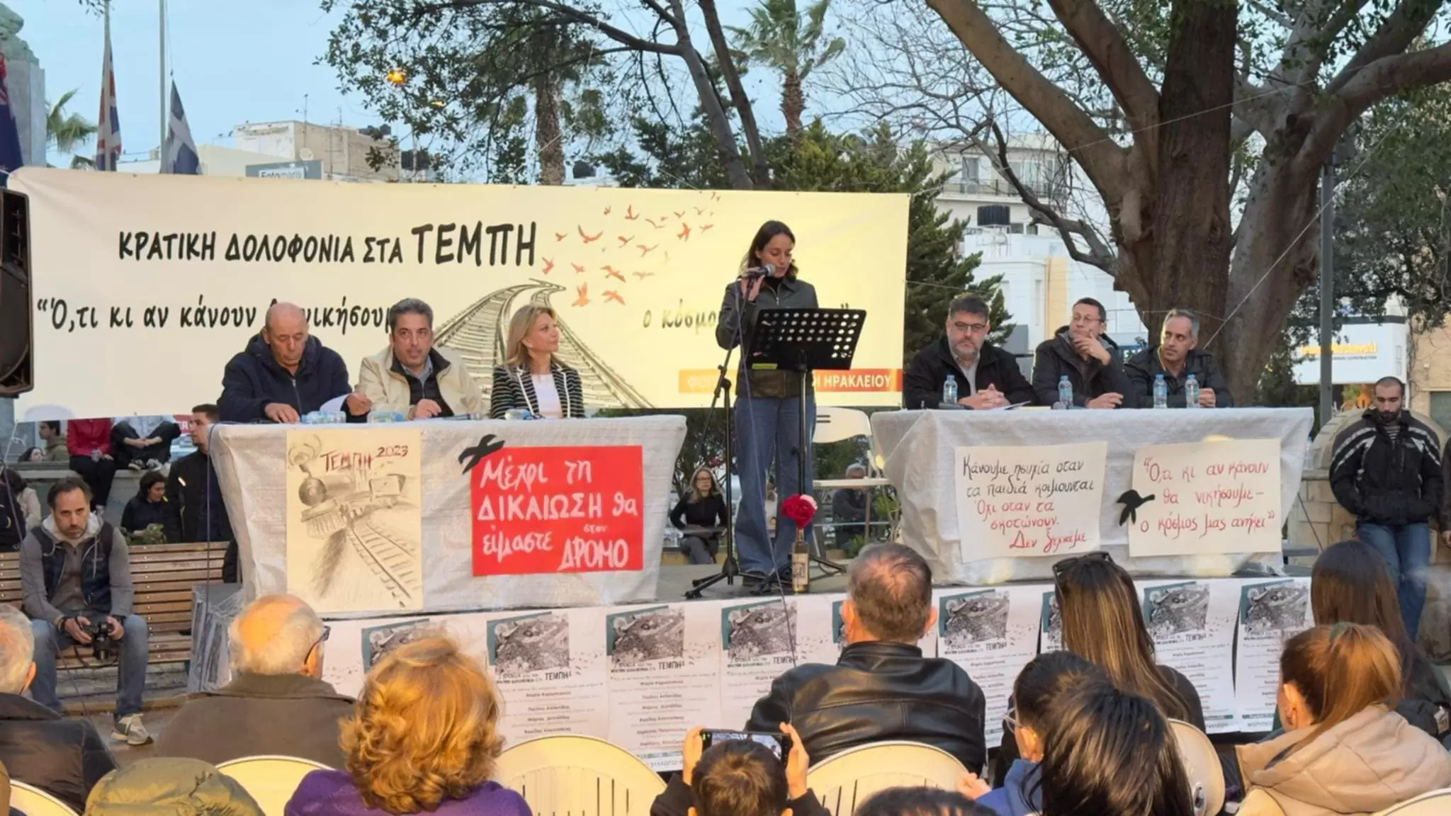 Στο Πάρκο Γεωργιάδη, στο Ηράκλειο, πραγματοποιείται αυτή την ώρα εκδήλωση για τα δύο χρόνια από το τραγικό δυστύχημα στα Τέμπη.