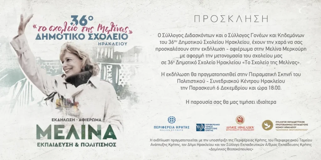 Ο Σύλλογος Διδασκόντων και ο Σύλλογος Εκπαιδευτικών Α/θμιας Εκπ/σης Ηρακλείου την Παρασκευή 6 Δεκεμβρίου 2024 στις 6:00 μ.μ. πραγματοποιεί εκδήλωση στην Πειραματική Σκηνή του Πολιτιστικού Συνεδριακού Κέντρου στο Ηράκλειο Κρήτης με αφορμή τη μετονομασία του Σχολείου σε 36ο Δημοτικό Σχολείο Ηρακλείου «το Σχολείο της Μελίνας».