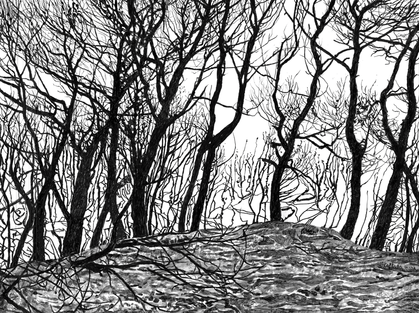 ενδιάμεσο, μεταιχμιακό χώρο, ανάμεσα στο φωτεινό και στο σκοτεινό, στην περιοχή όπου τα δύο αυτά στοιχεία αλληλεπιδρούν και συνυπάρχουν, όπως άλλωστε και τα έργα τους. Ο τίτλος όμως υποδηλώνει και το στοιχείο της αβεβαιότητας που χαρακτηρίζει τη ζωή σήμερα, την αίσθηση αμφιβολίας για το μέλλον του πλανήτη, εξαιτίας της κλιματικής κρίσης. Τα δίχρωμα, μαυρόασπρα έργα της Αντιγόνης Καββαθά και της Αντωνίας Παπατζανάκη αποδίδουν με τον καλύτερο τρόπο αυτήν την εύθραυστη ισορροπία, τη συνύπαρξη αντίθετων δυνάμεων, το μυστήριο του χρόνου. Σε αντίθεση με τον ανατολικό πλάτανο, κάτω από τα καμένα δέντρα ο ελαφρύς αέρας δεν ανακατεύει τις σκιές, το φως δεν έχει χώρο να παίξει. Αλλά το καμένο δέντρο δεν χάνει την ομορφιά του και θα αναγεννηθεί μέσα από τις στάχτες του. Το μάθημα ζωής που παίρνουμε από τα δέντρα -κι αυτό ακριβώς μας βοηθούν να κατανοήσουμε οι δύο καλλιτέχνιδες- είναι ότι τα έχουμε ανάγκη. Αν θέλουμε η ελπίδα (το φως) να νικήσει την απόγνωση (το σκοτάδι) και η ζωή στον πλανήτη Γη να συνεχίσει να υπάρχει.»