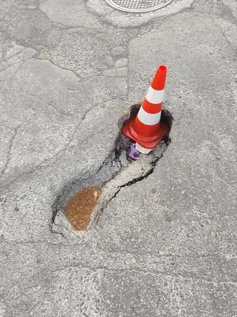 Η τρύπα μεγάλωσε και απέκτησε και…κώνο !! Κάποιος σκέφτηκε να τοποθετήσει έναν πορτοκαλή κώνο , ώστε να προστατέψει πεζούς και οχήματα απο ατύχημα