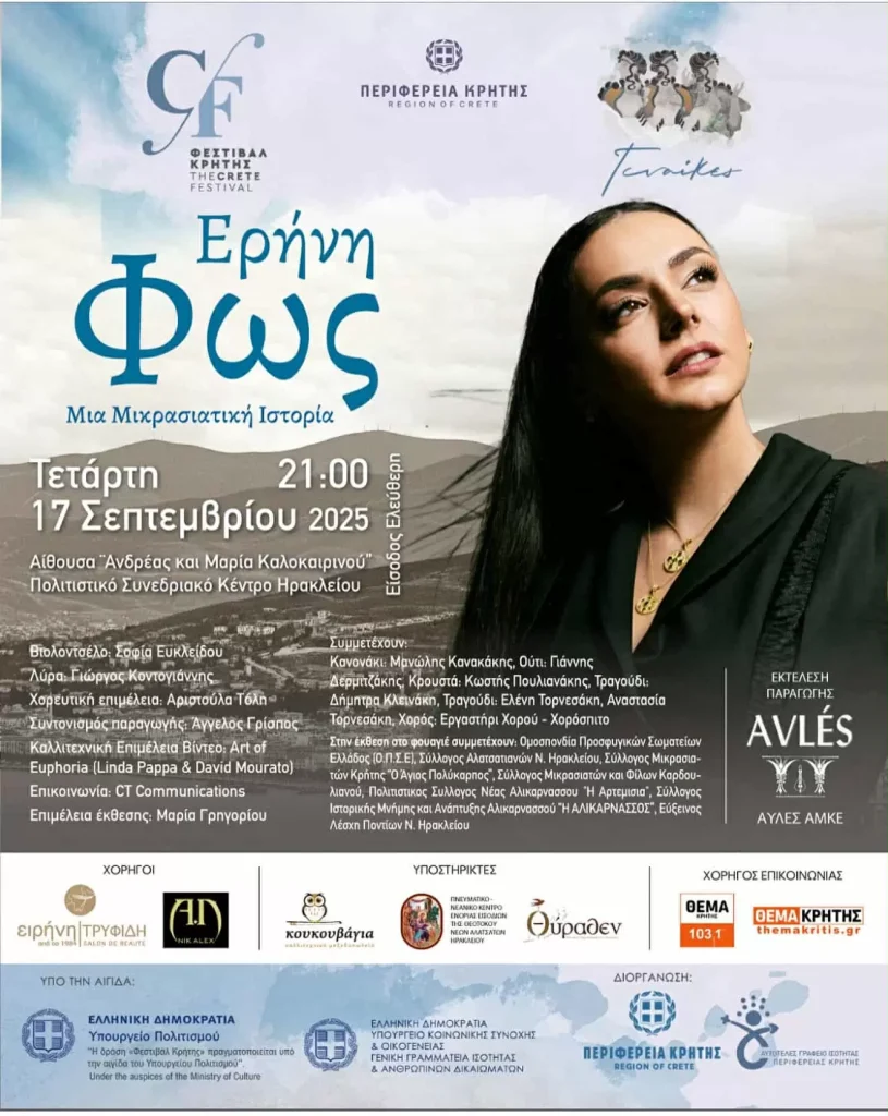 Η Περιφέρεια Κρήτης και η ΑΥΛΕΣ ΑΜΚΕ παρουσιάζουν τη συναυλία « Ερήνη – Φως: Μια Μικρασιατική Ιστορία», ένα μοναδικό καλλιτεχνικό γεγονός που θα πραγματοποιηθεί την Τετάρτη 17 Σεπτεμβρίου στο Πολιτιστικό Συνεδριακό Κέντρο Ηρακλείου. Η Ηρακλειώτισσα ερμηνεύτρια Ερήνη, με διεθνή διαδρομή και έδρα τη Νέα Υόρκη, επιστρέφει στον τόπο της με μια παράσταση αφιερωμένη στη μικρασιατική της κληρονομιά. Το « Φως » είναι ένα έργο που παντρεύει μικρασιατικά τραγούδια σε σύγχρονες ενορχηστρώσεις με αρχειακό και οπτικοακουστικό υλικό, φέρνοντας στο προσκήνιο την ιστορία των Μικρασιατών προσφύγων και Μικρασιατισσών προσφυγισσών, καθώς και τον καθοριστικό ρόλο των κρητικών κοινοτήτων ως φορέων μνήμης και δημιουργίας. Με προσωπική έρευνα σε Σμύρνη, Βουρλά και Κριτζαλιά, η Ερήνη ξετυλίγει ένα ταξίδι αναζήτησης ριζών και ταυτότητας, που συνδέει το χθες με το σήμερα. Μέσα από κινηματογραφικές αφηγήσεις σε ύφος ντοκιμαντέρ, συνδυασμένες με ζωντανές ερμηνείες, η παράσταση γίνεται μια σύγχρονη ανάγνωση της ιστορικής μνήμης και μια γιορτή της δύναμης της φωνής να μεταφέρει πολιτισμό και ελπίδα. Οι συντελεστές της παράστασης Τραγούδι, Καλλιτεχνική επιμέλεια : Ερήνη Βιολοντσέλο : Σοφία Ευκλείδου Λύρα : Γιώργος Κοντογιάννης Κανονάκι : Μανώλης Κανακάκης Ούτι : Γιάννης Δερμιτζάκης Κρουστά : Κωστής Πουλιανάκης Τραγούδι : Δήμητρα Κλεινάκη, Ελένη Τορνεσάκη, Αναστασία Τορνεσάκη Χορός: Εργαστήρι Χορού – Χορόσπιτο  Χορευτική επιμέλεια: Αριστούλα Τόλη Καλλιτεχνική επιμέλεια βίντεο: Art of Euphoria (Linda Pappa & David Mourato) Συντονισμός παραγωγής: Άγγελος Γρίσπος Επικοινωνία: CT Communications Διοργάνωση: Περιφέρεια Κρήτης Εκτέλεση Παραγωγής: ΑΥΛΕΣ ΑΜΚΕ