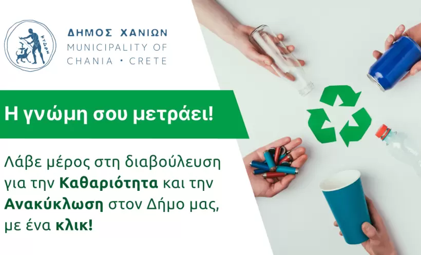 Ο Δήμος Χανίων καλεί όλους τους πολίτες να συμμετάσχουν στη διαδικτυακή δημόσια διαβούλευση για το ζήτημα της καθαριότητας και της ανακύκλωσης, καταθέτοντας τις απόψεις και τις προτάσεις τους, με στόχο τη βελτίωση των παρεχόμενων υπηρεσιών από τον Δήμο.