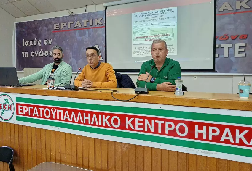 Σε εξέλιξη βρίσκεται η ευρεία σύσκεψη στο Εργατικό Κέντρο Ηρακλείου που συγκάλεσε απόψε 28 Απριλίου το Σωματείο Εργαζομένων του ΠΑΓΝΗ για την ψυχική υγεία στην Κρήτη.