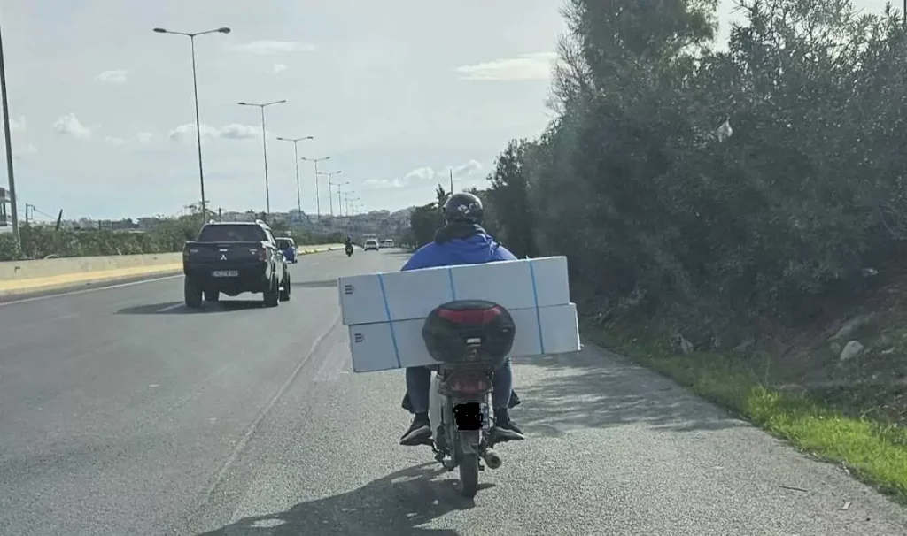 Δε φταίνε μόνο οι δρόμοι για τα τροχαία… Φταίει και το κεφάλι μας… Όσες καμπάνιες κι αν οργανωθούν, όποια μηνύματα κι αν σταλούν, φαίνεται ότι ο Κρητικός οδηγός δε… βάζει μυαλό. Παρά τα πολλά τροχαία δυστυχήματα στην Κρήτη, παρά τις θλιβερές πρωτιές του νησιού, η κατάσταση δύσκολα μάλλον θα βελτιωθεί. Όπως μπορεί κάποιος να δει στη φωτογραφία, οδηγός δίκυκλου αποφάσισε να κάνει μεταφορά ογκωδών αντικειμένων με το μηχανάκι του και να διασχίσει τον ΒΟΑΚ. Επικίνδυνο εγχείρημα τόσο για τη δική του σωματική ακεραιότητα, όσο και για τον υπόλοιπων, που βρίσκονται στην εθνική οδό.