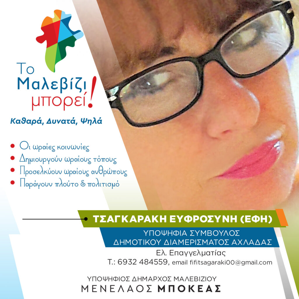 Το δικό της μήνυμα για τις εκλογές δίνει η υποψήφια Σύμβουλος Δημοτικού Διαμερίσματος Αχλάδας με την παράταξη «Το Μαλεβίζει Μπορεί» Έφη Τσαγκαράκη.