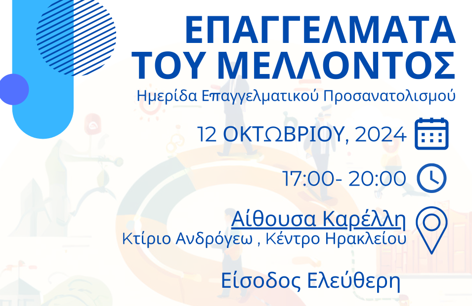 Ο Δήμος Ηράκλειου μέσω των Αντιδημαρχιών Εθελοντισμού και Παιδείας διοργανώνει ημερίδα Επαγγελματικού Προσανατολισμού με θέμα: «Επαγγέλματα του μέλλοντος», σε συνεργασία με το Youth Crete. Η ημερίδα θα πραγματοποιηθεί το Σάββατο 12 Οκτώβριου 2024 στην αίθουσα «Μανόλης Καρέλλης» του Δημοτικού κτιρίου της οδού Ανδρόγεω από τις 17:00 έως 20:00. Η εκδήλωση είναι ανοιχτή σε όλους τους μαθητές Λυκείου και Γ΄ Γυμνασίου, στους γονείς τους, αλλά και σε καθηγητές που επιθυμούν να ενημερωθούν για θέματα επαγγελματικού προσανατολισμού. Η επιλογή σπουδών είναι μια κρίσιμη απόφαση για κάθε ελληνική οικογένεια, καθώς υπάρχουν πλέον παραπάνω από 500 τμήματα προπτυχιακών σπουδών και παραπάνω από 1000 προγράμματα μεταπτυχιακών σπουδών. Οι θεματικές ενότητες που θα παρουσιαστούν είναι οι εξής: – Πώς οι σπουδές εξελίσσονται σε επάγγελμα; – Επαγγέλματα με μέλλον και προοπτικές: ποιες σπουδές οδηγούν σε αυτά – Πανεπιστημιακά τμήματα και οι επαγγελματικές τους προοπτικές – Σχολές με χαμηλές βάσεις που οδηγούν σε επαγγελματική επιτυχία – Χορήγηση υποτροφιών – Κόστος διαβίωσης των φοιτητών και οικονομική στήριξη – Κεντρικός ομιλητής στην ημερίδα θα είναι ο Δημήτρης Σαμψωνίδης, Σύμβουλος Σταδιοδρομίας στο Πανεπιστήμιο Κρήτης και Υποψήφιος Διδάκτωρ του Επαγγελματικού Προσανατολισμού. Είναι ο Host του Podcast “Χτίζω Καριέρα” που ασχολείται με Θέματα Καριέρας και Επαγγελματικής Ανάπτυξης ενώ έχει διατελέσει Σύμβουλος Σταδιοδρομίας στο Πολυτεχνείο Κρήτης.