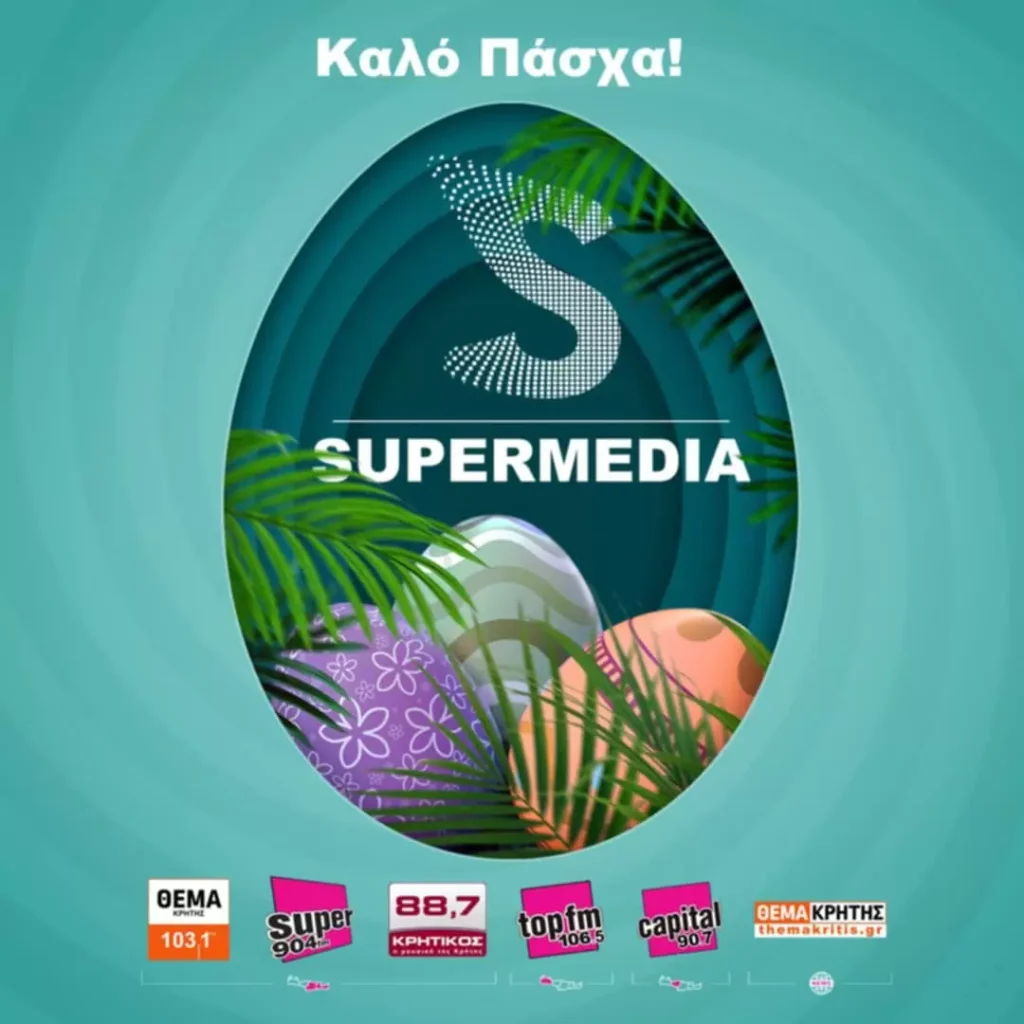 Η διοίκηση, το προσωπικό, οι παραγωγοί και οι δημοσιογράφοι της Super Media σας εύχονται χρόνια πολλά! Όλοι εμείς από το ΘΕΜΑ ΚΡΗΤΗΣ 103.1, τον SUPER 904, τον ΚΡΗΤΙΚΟ 88.7, τον TOP FM 106.5 για τα Χανιά, τον CAPITAL 90.7 για το Ρέθυμνο και το themakritis.gr για την Κρήτη, την Ελλάδα και τον κόσμο, σας ευχόμαστε Χριστός Ανέστη, με χαρά, υγεία, ελπίδα κι αγάπη! Ας γιορτάσουμε μαζί την Ανάσταση του Θεανθρώπου με αισιοδοξία και πίστη σε ένα καλύτερο αύριο.