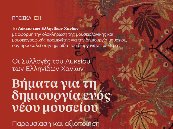 Το Λύκειο των Ελληνίδων Χανίων σας προσκαλεί σε ημερίδα, που συνδιοργανώνει με την Περιφέρεια Κρήτης – Π.Ε. Χανίων, με θέμαΟι Συλλογές του Λυκείου των Ελληνίδων Χανίων –Βήματα για τη Δημιουργία ενός Νέου Μουσείου –Παρουσίαση και Αξιοποίηση
