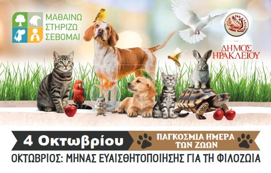 Μήνας ευαισθητοποίησης για τη φιλοζωία και το περιβάλλον είναι ο Οκτώβριος για το Δήμο Ηρακλείου και στο πλαίσιο της Παγκόσμιας Ημέρας των Ζώων, στις 4 Οκτωβρίου, ανακοινώνει την οργάνωση «Ανοικτών Ημερών – Open Days» των πολιτών στο Κυνοκομείο Ηρακλείου με στόχο την ενημέρωση και ευαισθητοποίηση αυτών για τα αδέσποτα και δεσποζόμενα ζώα.