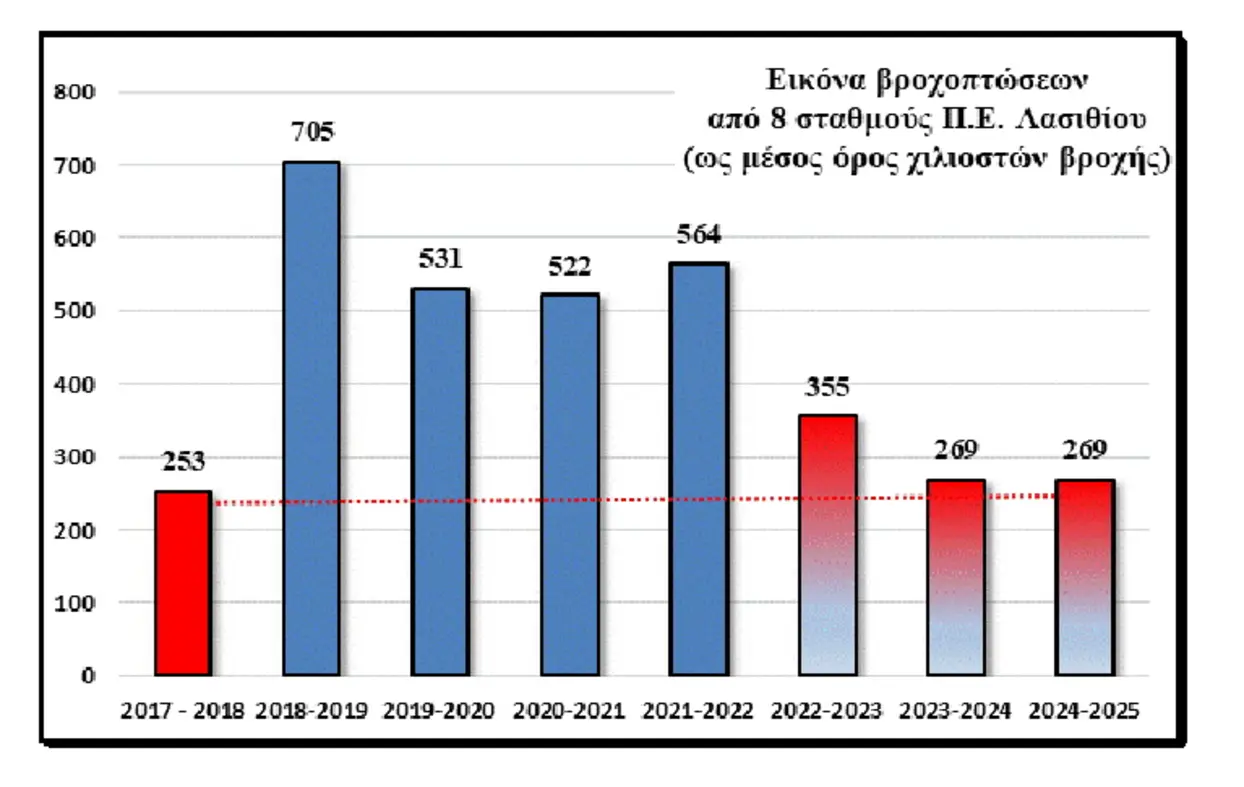 Για την Π.Ε. Λασιθίου έχει γίνει συλλογή δεδομένων βροχοπτώσεων από 8 σταθμούς. Τα δεδομένα δείχνουν ότι, οι βροχοπτώσεις του έτους 2022-2023 είναι υψηλότερες από εκείνες του ξηρού έτους 2017-2018, γεγονός που εν μέρει οφείλεται στα πλημμυρικά φαινόμενα που σημειώθηκαν τον Οκτώβριο του 2022. Σε ότι αφορά τις βροχοπτώσεις 2023-2024 καθώς και τις φετινές βροχοπτώσεις, κυμαίνονται στα ίδια περίπου επίπεδα με το ξηρό έτος αναφοράς, 2017-2018.