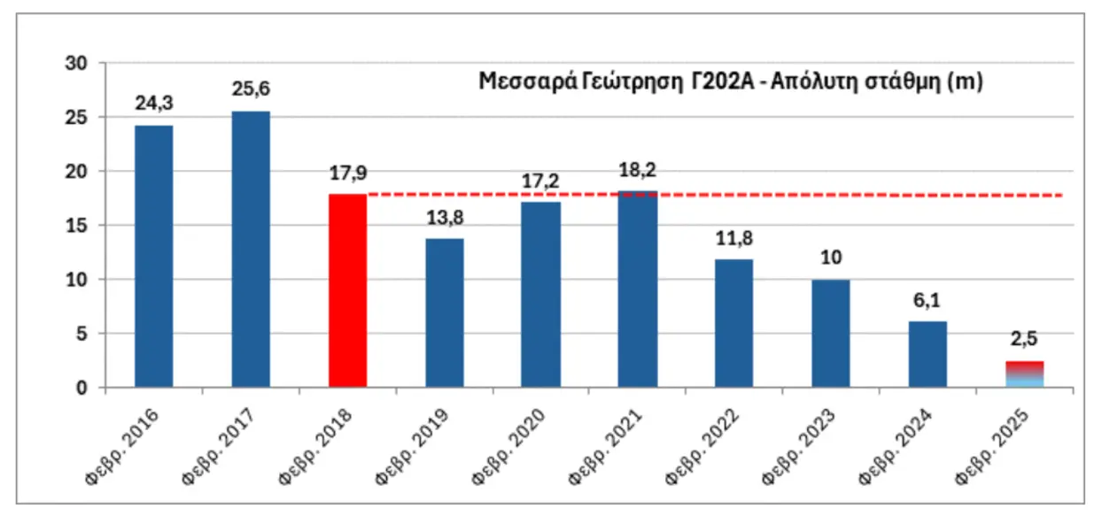 Φράγματα 1. Το φράγμα Μπραμιανών στην Ιεράπετρα έχει ωφέλιμο όγκο νερού 14.500.000 κυβικά μέτρα. Στα μέσα Μαρτίου 2025, η ποσότητα νερού του φράγματος ανερχόταν σε 3.897.100 κυβικά μέτρα, ενώ κατά τον περυσινό Μάρτιο η ποσότητα νερού έφτανε στα 9.575.100 κυβικά μέτρα. 2. Το φράγμα Φανερωμένης στη Μεσσαρά με ωφέλιμο όγκο νερού 18.000.000 κυβικά μέτρα, είναι σε πολύ χαμηλά για την εποχή επίπεδα, και η ποσότητα του διαθέσιμου νερού βρίσκεται στο όριο ασφάλειας λειτουργίας του φράγματος. 3. Το φράγμα Αποσελέμη με ωφέλιμο όγκο νερού 27.000.000 κυβικά μέτρα, επίσης είναι σε πολύ χαμηλά για την εποχή επίπεδα (στοιχεία Ο.Α.Κ.). Τον Μάρτιο του 2024 τα αποθέματα ανέρχονταν σε 7.350.000 κυβικά μέτρα, ενώ τον φετινό Μάρτιο ανέρχονται σε 3.400.000 κυβικά μέτρα. 4. Το φράγμα Ποταμών στο Ρέθυμνο με ωφέλιμο όγκο νερού 17.500.000 κυβικά μέτρα, αντιθέτως με τα προηγούμενα φράγματα είναι σχεδόν πλήρες, ωστόσο αυτό δεν οφείλεται στις βροχοπτώσεις αλλά στο γεγονός ότι αξιοποιούνται μικρές ποσότητες νερού για άρδευση και ύδρευση.