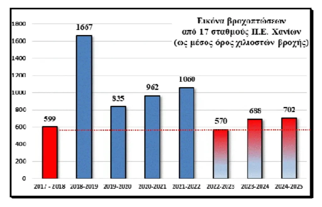 Για την Π.Ε. Χανίων έχει γίνει συλλογή δεδομένων βροχοπτώσεων από 17 σταθμούς. Η εικόνα δείχνει ότι οι περυσινές και οι φετινές βροχοπτώσεις κυμαίνονται σε ικανοποιητικά επίπεδα,σε σχέση με εκείνες του ξηρού έτους 2017-2018, αν και υπολείπονται των προηγούμενων υγρών ετών.