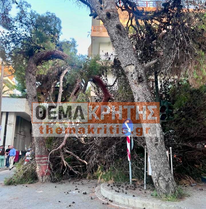 Στο σημείο βρέθηκαν οι Αντιδήμαρχοι Γιώργος Καραντινός και Νίκος Γιαλιτάκης για να συντονίσουν τις ενέργειες απομάκρυνσης των πεσμένων τμημάτων του δέντρου.