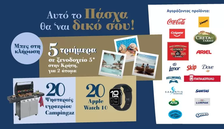 Η κλήρωση θα πραγματοποιηθεί την Δευτέρα 19.05.25! Τα προϊόντα που συμμετέχουν στην κλήρωση είναι CRETA FARMS εν ελλάδι, LURPAK, HELLMANN’S, Knorr, Arla, ΠΑΠΑΔΟΠΟΥΛΟΥ, Merenda, Oreo, ΠΑΥΛΙΔΗΣ, PHILADELPHIA, KYKNOS, Coca Cola, Schweppes ή Αmita FREE, bioten, Carroten, Noxzema, ORZENE, SANITAS, Tesori, AVA, Skip,OMO, Cajoline, KLINEX, Dove, ULTREX, AXE, AIM, CIF, LUX, VASELINE,TRESEMME, PerioGard, Colgate, PALMOLIVE, Sanex, Soupline, AJAX, ARIEL και Lenor