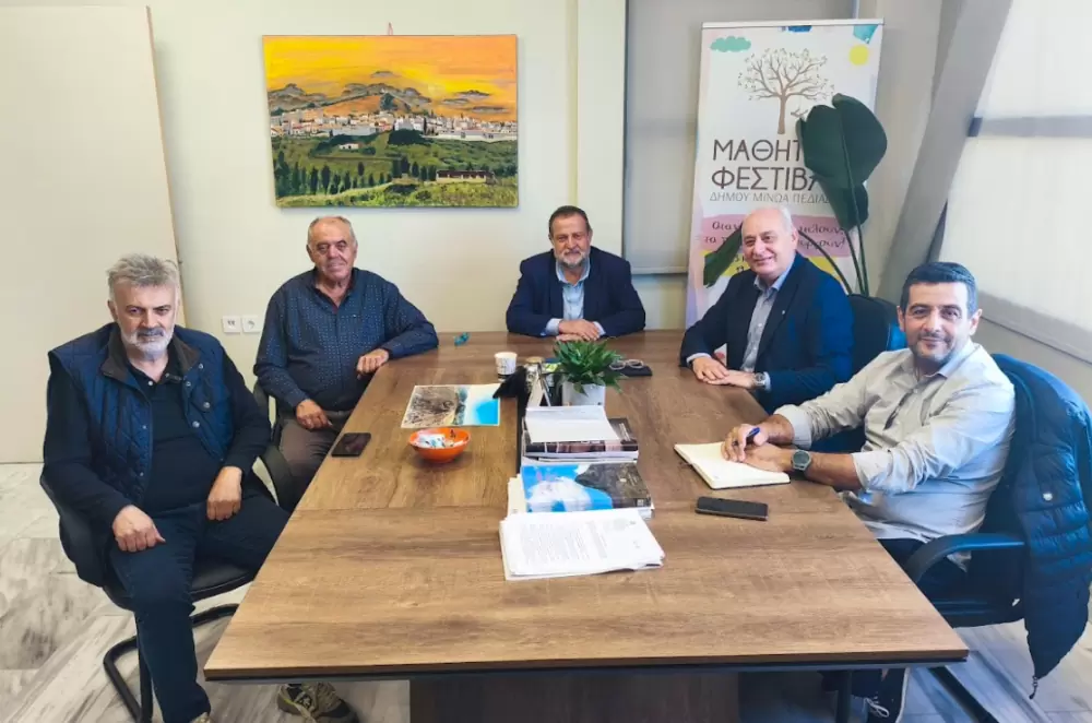 Συνάντηση εργασίας, πραγματοποιήθηκε την Πέμπτη 23 Οκτωβρίου, μεταξύ του δημάρχου Μινώα Πεδιάδας, Βασίλη Κεγκέρογλου και του δημάρχου Βιάννου, Παύλου Μπαριτάκη, παρουσία των αντιδημάρχων, Γιάννη Συμιανάκη και Θόδωρου Καρτσάκη, καθώς και του Δημοτικού Συμβούλου, Μιχάλη Σαμωνάκη.