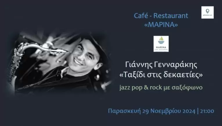 Την Παρασκευή 29 Νοεμβρίου, στις 21:00 ο Γιάννης Γενναράκης με το σαξόφωνό του θα κάνει ένα «Ταξίδι στις δεκαετίες» με μία επιλογή τραγουδιών Jazz, Pop, Rock.