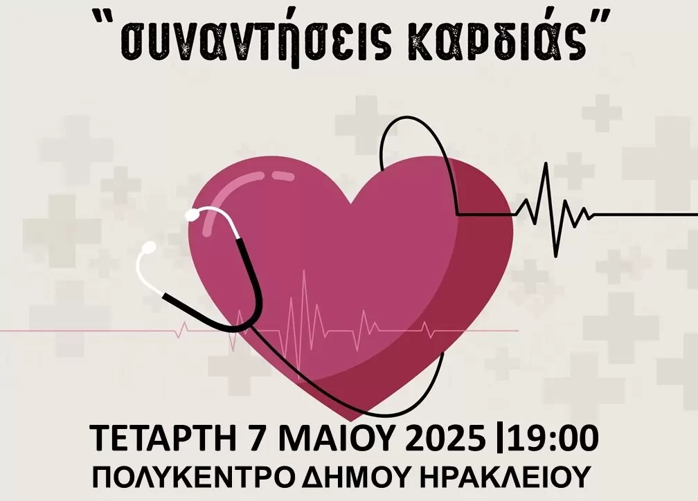 Υπενθυμίζεται ότι στις «Συναντήσεις Καρδιάς» που έχουν ως στόχο την πρόληψη και την ενημέρωση του κοινού γύρω από τα καρδιολογικά προβλήματα, διακεκριμένοι καρδιολόγοι προσφέρουν πολύτιμες πληροφορίες για την πρόληψη αλλά και για την καλύτερη αντιμετώπιση των καρδιολογικών νοσημάτων τα οποία αποτελούν την πρώτη αιτία θανάτου. Οι ομιλίες, με ελεύθερη συμμετοχή για το κοινό, θα πραγματοποιούνται μία φορά το μήνα εκ περιτροπής στο κέντρο του Ηρακλείου και στην περιφέρεια της πόλης.