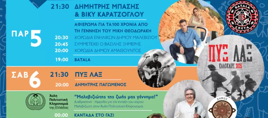 Η καρδιά της μουσικής, της παράδοσης και του πολιτισμού θα χτυπήσει στο Μαλεβίζι το τριήμερο 5, 6 και 7 Σεπτεμβρίου, στην πλατεία Μιχάλη Κατσαμάνη στο Γάζι, όπου θα πραγματοποιηθεί το 3ο Malevizi Festival.