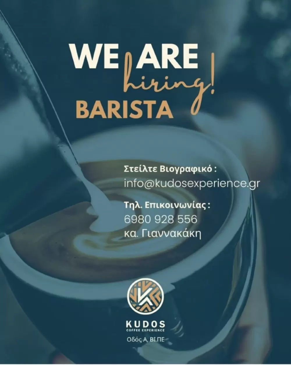 Θέση για έναν ειδικό του καφέ , με εμπειρία και όρεξη για εξυπηρέτηση των πελατών ζητείται από το καφέ Kudos ,που στεγάζεται στην επιχείρηση καυσίμων Super Creta Gas