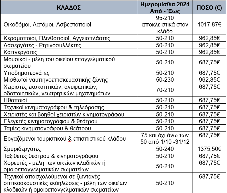 Δικαιούχοι είναι εργαζόμενοι ασφαλισμένοι στον e-ΕΦΚΑ που ασκούν ένα από τα παρακάτω επαγγέλματα: Οικοδόμου, λατόμου, ασβεστοποιού, κεραμοποιού, πλινθοποιού, αγγειοπλάστη, δασεργάτη, ρητινοσυλλέκτη, καπνεργάτη, μουσικού – μέλους οικείου επαγγελματικού σωματείου, υποδηματεργάτη, μισθωτού ναυπηγοεπισκευαστικής ζώνης, χειριστή εκσκαπτικών, ανυψωτικών, οδοποιητικών, γεωτρητικών μηχανημάτων, ηθοποιού, τεχνικού κινηματογράφου και τηλεόρασης, χειριστή και βοηθού χειριστή κινηματογράφου, ελεγκτή κινηματογράφου και θεάτρου, ταμία κινηματογράφου και θεάτρου, εργαζόμενου τουριστικού και επισιτιστικού κλάδου, σμυριδεργάτη, ταξιθέτου θεάτρου – κινηματογράφου, χορευτή – μέλους οικείων κλαδικών ή ομοιοεπαγγελματικών σωματείων, καθώς και τεχνικού απασχολούμενου σε ζωντανές οπτικοακουστικές εκδηλώσεις – μέλους οικείων κλαδικών ή ομοιοεπαγγελματικών σωματείων.