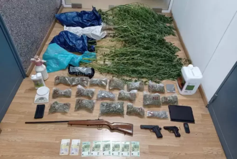 Σε επακόλουθες έρευνες που πραγματοποιήθηκαν σε οικίες και λοιπούς χώρους που χρησιμοποιούσαν, συνολικά βρέθηκαν και κατασχέθηκαν: 18 νάιλον συσκευασίες που περιείχαν ακατέργαστη κάνναβη συνολικού μεικτού βάρους 1 κιλού και 212 γραμμαρίων, 4 δενδρύλλια κάνναβης στο στάδιο της ανάπτυξης ύψους από 175 έως 185 εκατοστά, 6 νάιλον συσκευασίες που περιείχαν κοκαΐνη συνολικού μεικτού βάρους 15,8 γραμμαρίων, αυτοσχέδια συσκευασία (αλουμινόχαρτο) που περιείχε βραστή κοκαΐνη μεικτού βάρους 2,6 γραμμαρίων, 2 ηλεκτρονικές ζυγαριές ακριβείας, καραμπίνα τύπου Flaubert, 2 πιστόλια με αποστομωμένη κάνη, το χρηματικό ποσό των 2.000 ευρώ, 3 συσκευές κινητών τηλεφώνων, φορητός ηλεκτρονικός υπολογιστής, 2 φορητές συσκευές αποθήκευσης USB stick και Ι.Χ.Ε αυτοκίνητο και δίκυκλο μοτοσυκλέτα.