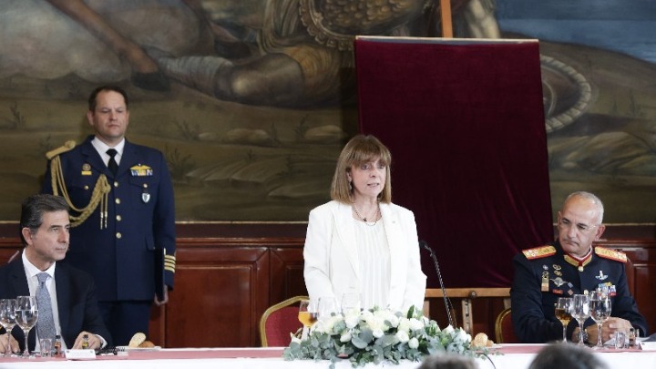 «H Ελλάδα, παράλληλα με την προώθηση των εθνικών της συμφερόντων, παραμένει σταθερά προσηλωμένη στην προώθηση της ειρήνης και του διαλόγου», επισήμανε η Πρόεδρος της Δημοκρατίας, Κατερίνα Σακελλαροπούλου, η οποία αναφέρθηκε στις πολεμικές συγκρούσεις στην Ουκρανία και τη Μέση Ανατολή, στο Κυπριακό και στις ελληνοτουρκικές σχέσεις, κατά την αντιφώνηση της στο γεύμα που παρέθεσε προς τιμή της στη Λέσχη Αξιωματικών Θεσσαλονίκης ο διοικητής του Γ’ Σώματος Στρατού αντιστράτηγος Αθανάσιος Γαρίνης. «Ζούμε σε μια εποχή αβεβαιότητας, γεωπολιτικής αναστάτωσης, έντονων διεθνών ανακατατάξεων, αιματηρών συγκρούσεων. Ο συνεχιζόμενος πόλεμος στην Ουκρανία παραμένει ανοιχτή πληγή στην Ευρώπη. Η γειτονιά μας φλέγεται, με απρόβλεπτες επιπτώσεις για το μέλλον ολόκληρης της Ανατολικής Μεσογείου. Η Μέση Ανατολή μοιάζει με πυριτιδαποθήκη, ενώ το ενδεχόμενο μιας γενικευμένης περιφερειακής κρίσης προκαλεί παγκόσμια ανησυχία. Οι προκλήσεις είναι πολλαπλές και υπερβαίνουν τα εθνικά μας σύνορα. Σε αυτό το ασταθές περιβάλλον η Ελλάδα, παράλληλα με την προώθηση των εθνικών της συμφερόντων, παραμένει σταθερά προσηλωμένη στην προώθηση της ειρήνης και του διαλόγου», σημείωσε η κυρία Σακελλαροπούλου. Με την ευκαιρία της συμπλήρωσης 50 χρόνων από την αποκατάσταση της Δημοκρατίας αναφέρθηκε στη θέση της Ελλάδας σήμερα καθώς και στο Κυπριακό, λέγοντας πως «η οριστική δικαίωση του κυπριακού αγώνα, στη βάση των αποφάσεων των Ηνωμένων Εθνών και του ενωσιακού κεκτημένου, αποτελεί το πιο υψηλό εθνικό μας χρέος». «Φέτος γιορτάζουμε τα 50 χρόνια από την πτώση του δικτατορικού καθεστώτος, που σημάδεψε τον λαό μας, και την έναρξη της Μεταπολίτευσης, της πιο ομαλής και προοδευτικής περιόδου της σύγχρονης ιστορίας μας. Η χώρα μας παγίωσε την παρουσία της στην καρδιά της Ευρωπαϊκής Ένωσης, αποτελώντας εγγυητή ασφάλειας στην ανατολική Μεσόγειο και την ευρύτερη περιοχή. Όσα πετύχαμε στη μακραίωνη διαδρομή μας τα πετύχαμε παραμένοντας σταθεροί στις θεμελιώδεις αξίες που ανατρέχουν στις βαθιές μας ρίζες, επιβεβαιώνοντας τη θέση μας ανάμεσα στους εταίρους μας, όπως αρμόζει στην ιστορία μας και μας κάνει περήφανους» τόνισε η Πρόεδρος της Δημοκρατίας και συνέχισε: «Όλα αυτά τα πενήντα χρόνια όμως, το τραύμα της Κύπρου παραμένει ανεπούλωτο. Η αποτρόπαιη τουρκική εισβολή και η κατοχή του ενός τρίτου και πλέον του εδάφους της Κυπριακής Δημοκρατίας, κατά παράβαση κάθε έννοιας διεθνούς νομιμότητας, συνεχίζει να μας πληγώνει βαθιά. Δεν ξεχνάμε ποτέ. Παραμένουμε αφοσιωμένοι στον αγώνα για την ανατροπή των εγκληματικών συνεπειών αυτής της βαρβαρότητας, του ξεριζωμού και του βίαιου εκτοπισμού χιλιάδων Κυπρίων, της μαζικής παραβίασης των ανθρωπίνων δικαιωμάτων, της σύλησης των ελληνικών πολιτιστικών μνημείων και της ορθόδοξης χριστιανοσύνης, αλλά και του προκλητικού, μέχρι και σήμερα, τουρκικού εποικισμού της αρχέγονης αυτής εστίας του ελληνισμού. Η οριστική δικαίωση του κυπριακού αγώνα, στη βάση των αποφάσεων των Ηνωμένων Εθνών και του ενωσιακού κεκτημένου, αποτελεί το πιο υψηλό εθνικό μας χρέος». Παράλληλα αναφέρθηκε στις ελληνοτουρκικές σχέσεις και υπογράμμισε: «Η Ελλάδα, αποδίδοντας ιδιαίτερη σημασία στην αρχή της καλής γειτονίας και καταβάλλοντας κάθε δυνατή προσπάθεια για την εμπέδωση και θεμελίωσή της, δεν έπαψε ποτέ να κρατά ανοιχτούς τους διαύλους επικοι