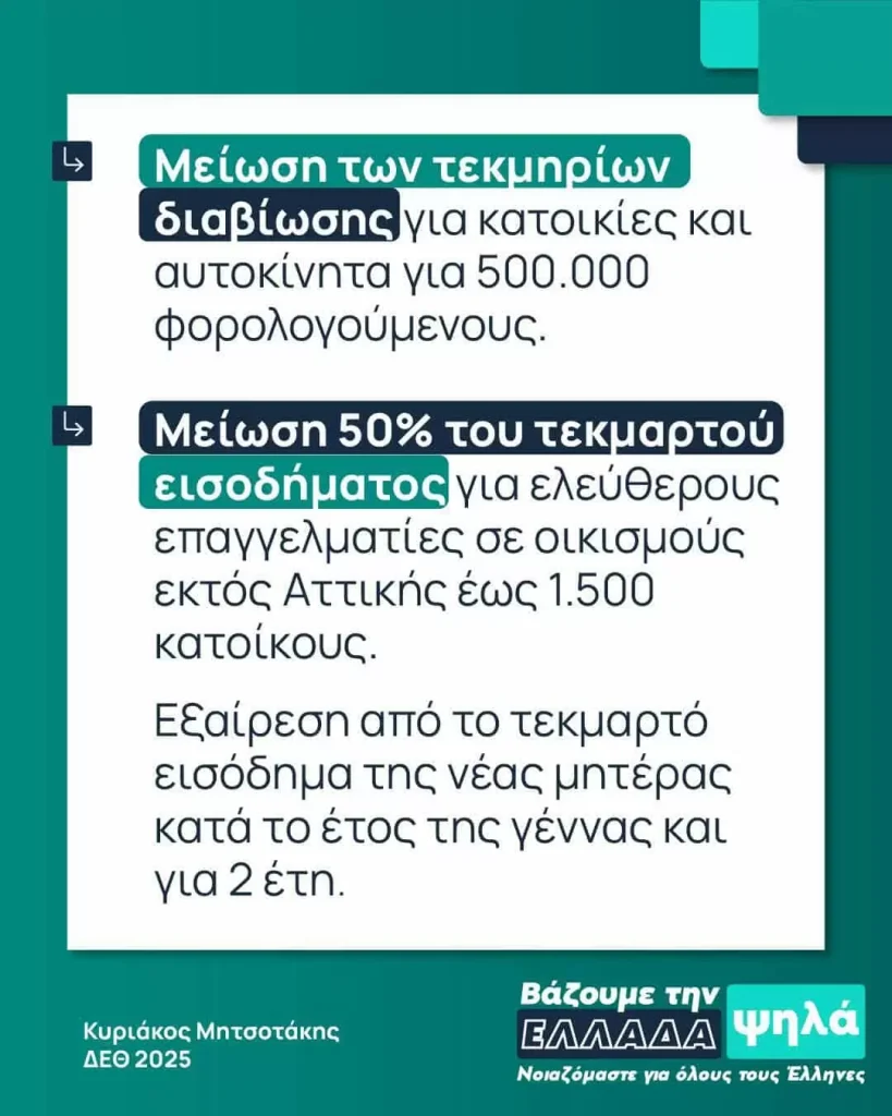 Ανακούφιση για 500.000 φορολογούμενους – Διεύρυνση ευνοϊκών ρυθμίσεων για επαγγελματίες σε μικρούς οικισμούς Τη μείωση των τεκμηρίων διαβίωσης που αφορούν κατοικίες και Ι.Χ. για περίπου 500.000 φορολογούμενους, καθώς και τη διεύρυνση των ευνοϊκών φορολογικών κριτηρίων για ελεύθερους επαγγελματίες που διαμένουν σε οικισμούς έως 1.500 κατοίκους, ανακοίνωσε σήμερα (06.09.2025) ο πρωθυπουργός Κυριάκος Μητσοτάκης, από το βήμα της 89ης Διεθνούς Έκθεσης Θεσσαλονίκης (ΔΕΘ).