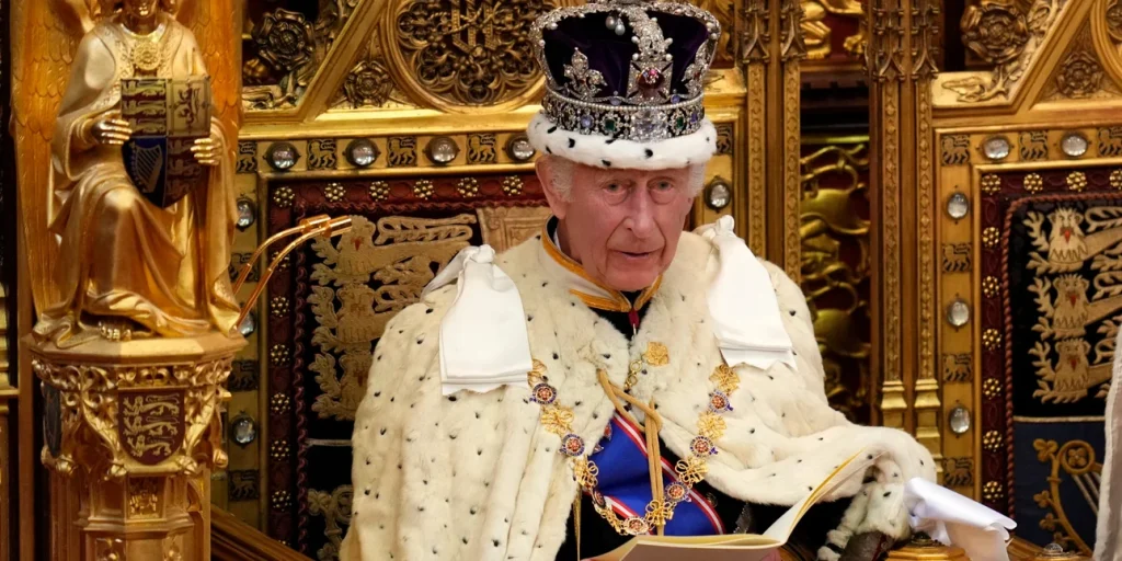 Ο βασιλιάς Κάρολος φαίνεται να εκνευρίζεται, καθώς βοηθός προσαρμόζει τη στολή του στα κρατικά εγκαίνια του Κοινοβουλίου.