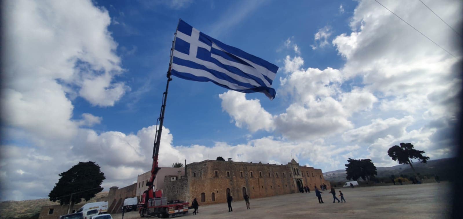 Συγκεκριμένα, πραγματοποιήθηκε με γερανοφόρο όχημα , στον προαύλιο χώρο της Ιεράς Μονής Αρκαδίου, με τη «γαλανόλευκη» να προκαλεί υπερηφάνεια και συγκίνηση.