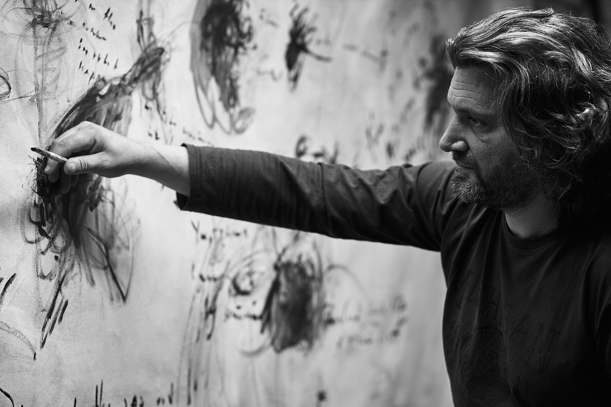 Τα ασπρόμαυρα μελάνια σε χαρτί του Γιώργου Χούντα αποτελούν σήμα κατατεθέν του καλλιτεχνικού του ιδιώματος. Στα έργα του κυριαρχεί το στοιχείο της γραφής, καθώς οι γραμμές που διακρίνονται μοιάζουν να θέλουν να διαμορφώσουν μία νέα αλφάβητο, που αντανακλά την αδυναμία επικοινωνίας μέσω του λόγου ή -κατά μία άλλη άποψη- την υπέρβασή του. Κάποιοι εντοπίζουν στο έργο του επιρροές και από την Ιαπωνία και τη δική της χαρακτηριστική γραφή. Η γραφή συναντά αφηρημένα σχήματα και γραμμές που μοιάζουν να πυκνώνουν και να εκρήγνυνται, εκφράζοντας μία εσωτερικότητα που ψάχνει τον αποδέκτη της σε κάθε θεατή και προσκαλώντας τον να δημιουργήσει τα δικά του νοήματα. Στην έκθεση θα δούμε μικρότερα, αλλά και εντυπωσιακά, μεγάλης κλίμακας έργα του, χαρακτηριστικά του καλλιτέχνη.