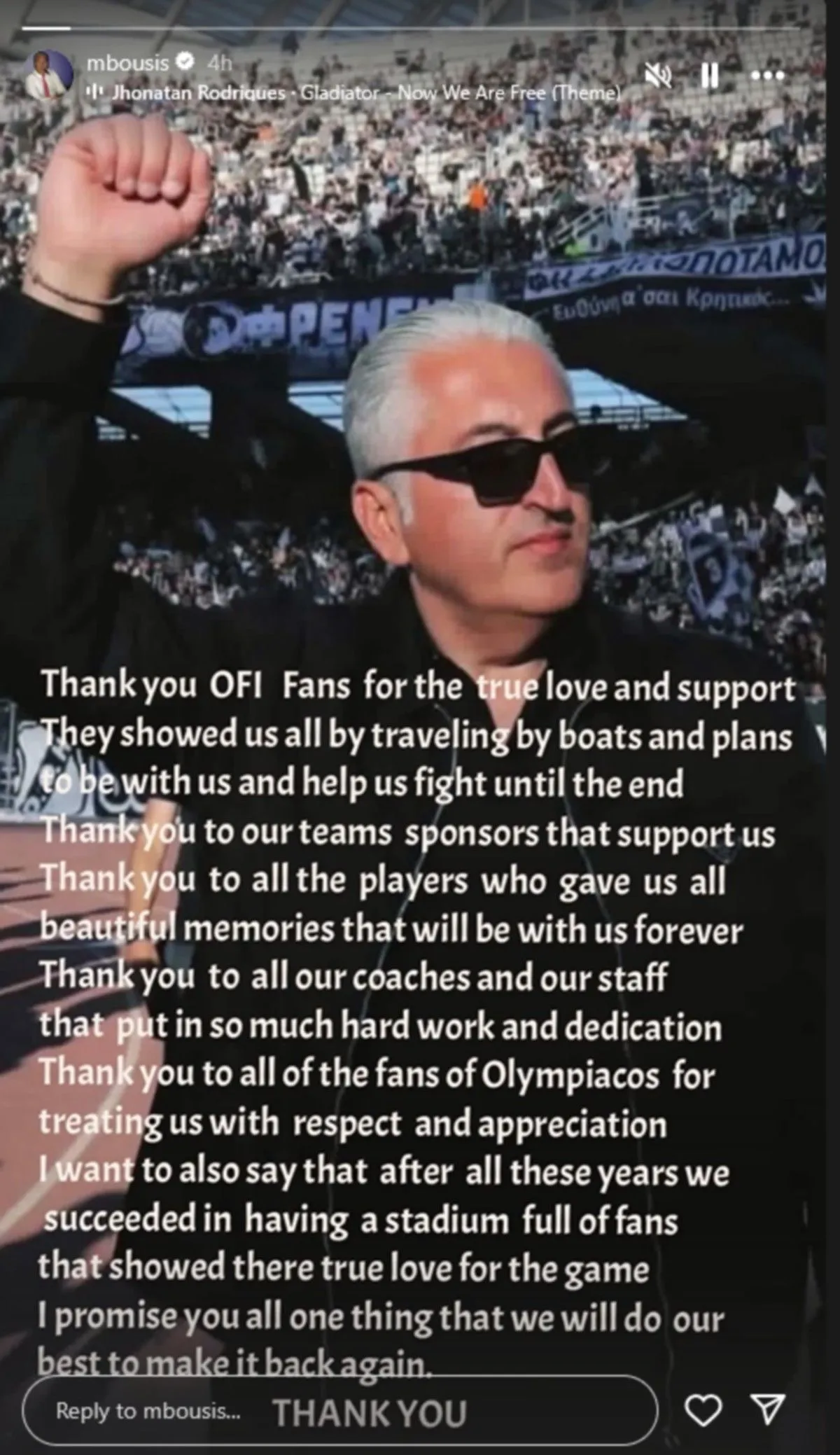 Ο πρόεδρος του ΟΦΗ, Μιχάλης Μπούσης, με ανάρτηση του στα social media ευχαρίστησε τον κόσμο για τη στήριξη του και την κινητοποίηση του στον τελικό.