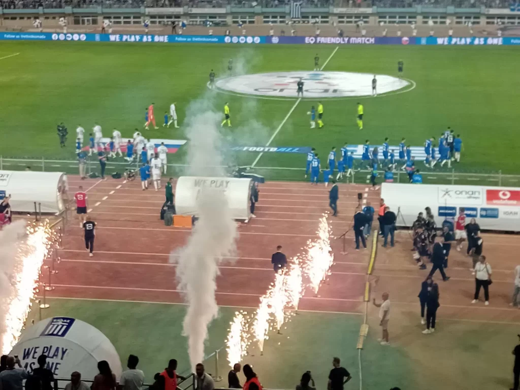 Δείτε την είσοδο των δύο ομάδων.  Η Εθνική Ελλάδας επέστρεψε στο Ηράκλειο και αυτή την ώρα αντιμετωπίζει σε παιχνίδι φιλικού χαρακτήρα τη Σλοβακία. Στο γήπεδο βρίσκεται περίπου 20.000 κόσμος, που έχει δημιουργήσει μια όμορφη ατμόσφαιρα… Παρακολουθείστε την είσοδο των δύο ομάδων.