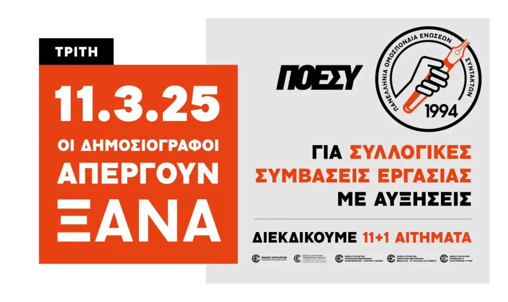 Από τις 5 το πρωί της Τρίτης, 11 Μαρτίου 2025 μέχρι τις 5 το πρωί της Τετάρτης, 12 Μαρτίου 2025 δεν θα μεταδίδονται ειδήσεις στην ροή. Σε σχετική ανακοίνωση το Διοικητικό Συμβούλιο της Ένωσης Συντακτών Ημερήσιων Εφημερίδων Πελοποννήσου – Ηπείρου – Νήσων, αναφέρεται: Στην απεργία συμμετέχουν οι δημοσιογράφοι σε εφημερίδες, περιοδικά, δημόσια, δημοτικά και ιδιωτικά ραδιοτηλεοπτικά Μέσα, ΑΠΕ-ΜΠΕ, Γραφεία Τύπου, διαδικτυακά Μέσα και σε κάθε άλλο χώρο εργασίας. Ακολουθεί η ανακοίνωση της ΠΟΕΣΥ: Τα Διοικητικά Συμβούλια της Πανελλήνιας Ομοσπονδίας Συντακτών (ΠΟΕΣΥ) και των δημοσιογραφικών Ενώσεων – μελών της (ΕΣΗΕΑ, ΕΣΗΕΜΘ, ΕΣΗΕΠΗΝ, ΕΣΗΕΘΣτΕΕ και ΕΣΠΗΤ) συναποφάσισαν την πραγματοποίηση νέας εικοσιτετράωρης απεργίας για όλους τους δημοσιογράφους, σε όλα τα ΜΜΕ της χώρας, από τις 5 το πρωί της Τρίτης, 11 Μαρτίου μέχρι τις 5 το πρωί της Τετάρτης, 12 Μαρτίου 2025. Η ΠΟΕΣΥ και οι Ενώσεις Συντακτών, προσηλωμένες με συνέπεια και σταθερότητα στην κεντρική διεκδίκηση του δικαιώματος όλων των δημοσιογράφων για αξιοπρεπείς μισθούς και αυξήσεις που κατοχυρώνονται μέσα από Συλλογικές Συμβάσεις Εργασίας, στοιχείο αναμφισβήτητο και για την ανεξαρτησία του Τύπου, απαιτούν από τους εργοδότες να εγκαταλείψουν την αδιάλλακτη στάση τους, να ανταποκριθούν στα μηνύματα της εποχής και να προσέλθουν στη διαδικασία των ελεύθερων συλλογικών διαπραγματεύσεων. Οι δημοσιογράφοι όλης της χώρας, στους τηλεοπτικούς και τους ραδιοφωνικούς σταθμούς, τις εφημερίδες, τα περιοδικά και τις ιστοσελίδες, διεκδικούμε μισθολογικές αυξήσεις, βελτίωση των εργασιακών συνθηκών και κατοχύρωση όλων των θεσμικών αιτημάτων μας. Διεκδικούμε τα εξής 11+1 αιτήματα : 1. Έναρξη ουσιαστικών και γόνιμων συλλογικών διαπραγματεύσεων με στόχο να μπει ένα τέλος στην ομηρία των ατομικών συμβάσεων εργασίας 2. Εισαγωγικό μισθό 1.250 ευρώ σε όλα τα ΜΜΕ 3. Αυξήσεις 10% με βάση τις τελευταίες Συλλογικές Συμβάσεις Εργασίας 4. Κατοχύρωση των αμοιβών για την εργασία τα Σαββατοκύριακα  (+25% και ρεπό για το Σάββατο και 100% για την Κυριακή)  και αύξηση των αποζημιώσεων για αποστολές εκτός έδρας 5. Ημερήσια αποζημίωση 350 ευρώ για αποστολές σε εμπόλεμες περιοχές και 250 ευρώ  για τις περιοχές που πλήττονται από φυσικές καταστροφές 6. Ενσωμάτωση των θεσμικών μας αιτημάτων στις Συλλογικές Συμβάσεις Εργασίας – Ενσωμάτωση των Αρχών Δεοντολογίας στις συμβάσεις – Συμφωνία για anti-Slapps ρυθμίσεις-Δεσμευτικοί κανόνες για την χρήση της Τεχνητής Νοημοσύνης στην Ενημέρωση 7. Δίκαιη αμοιβή για τα πνευματικά δικαιώματα των δημοσιογράφων στον έντυπο Τύπο, τους ραδιοτηλεοπτικούς σταθμούς και τις ιστοσελίδες 8. Έκτακτη οικονομική βοήθεια για την αντιμετώπιση της ακρίβειας, κατ’ αναλογία με τα δημόσια ΜΜΕ 9. Άρση των περιορισμών για την υπογραφή ενιαίας Συλλογικής Σύμβασης Εργασίας για τα δημόσια ΜΜΕ, με θεσμικούς και οικονομικούς όρους. Η ΣΣΕ στα ΜΜΕ του Δημοσίου και η ΚΥΑ για τις αποδοχές των δημοσιογράφων, ως ένα βαθμό, στήριξαν τους συναδέλφους την περίοδο της κρίσης. Σήμερα επιβάλλεται  η αύξηση, με εισαγωγικό μισθό πρώτης διετίας, στα 1250 ευρώ, ώστε να συμπαρασύρει και τα υπάρχοντα κλιμάκια. Επαναφορά του 13ου και 14ου μισθού στα δημόσια ΜΜΕ και της 13ης και 14ης σύνταξης για τους συνταξιούχους . 10. Προώθηση μέτρων για την καταπολέμηση της κερδοσκοπικής ακρίβειας σε είδη διατροφής, στην ενέργεια, τα ενοίκια 11. Άρση των περιορισμών για 