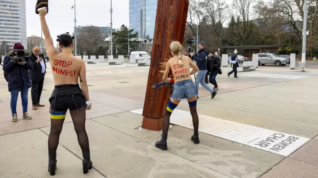Δύο γυναίκες τις οργάνωσης, που φορούσαν την ουκρανική σημαία ως καλτσοδέτες, επιχείρησαν με αλυσοπρίονα να καταστρέψουν γιγαντιαίο ξύλινο γλυπτό, με αποτέλεσμα την παρέμβαση της αστυνομίας. «Κρατήστε τη Ρωσία έξω από τα Ηνωμένα Έθνη» και «Γ… τη Ρωσία» φώναζαν καθώς πριόνιζαν την τρίποδη κατασκευή του Ελβετού καλλιτέχνη Ντανιέλ Μπερσέ, με τον τίτλο Σπασμένη Καρέκλα.